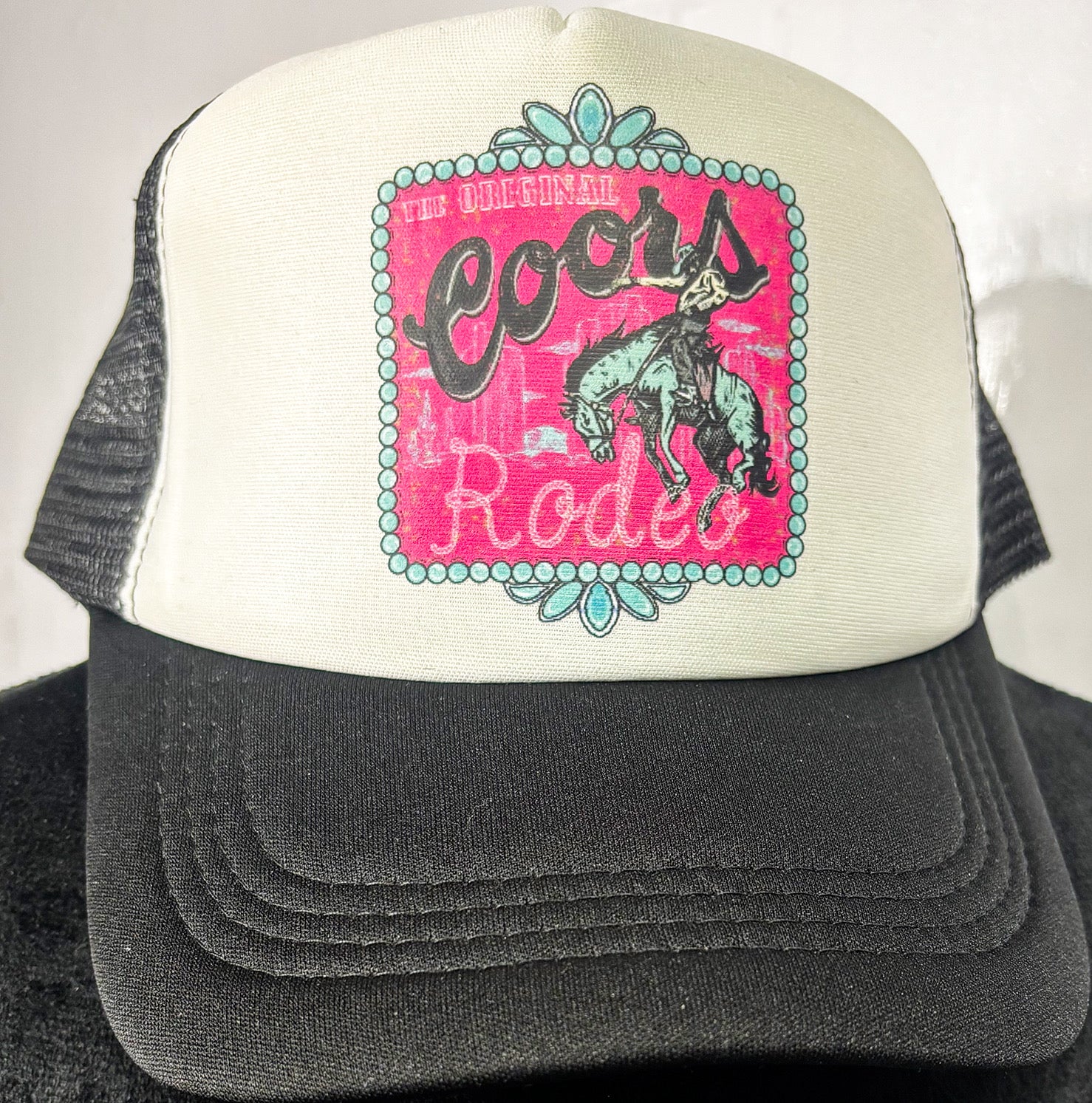 Pink Coors Rodeo trucker hat with curved bill