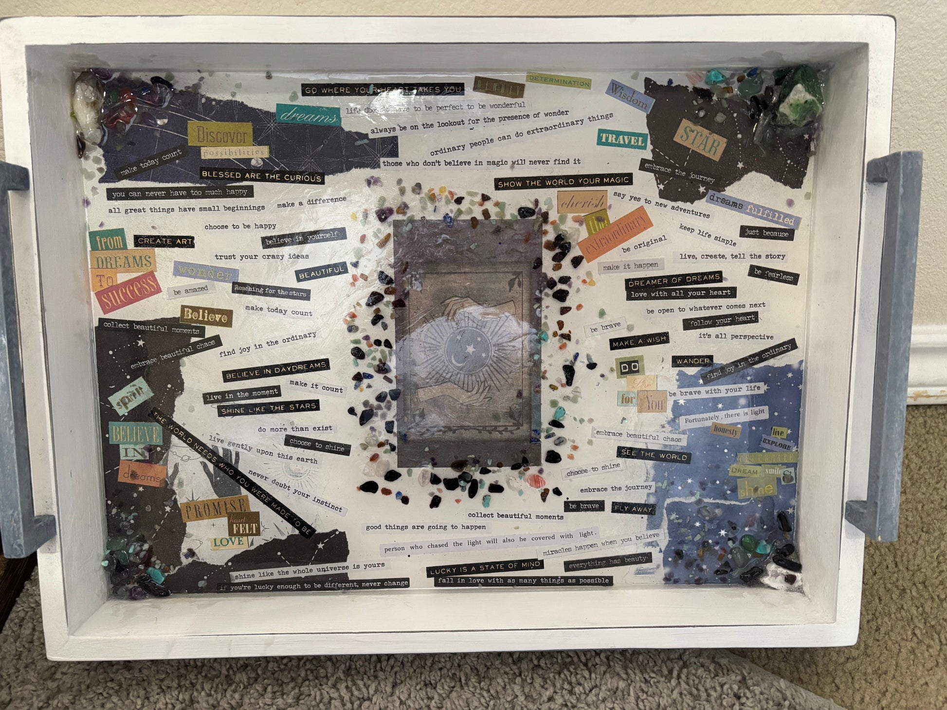 Motivational custom wooden epoxy serving tray, with healing crystals in the epoxy.