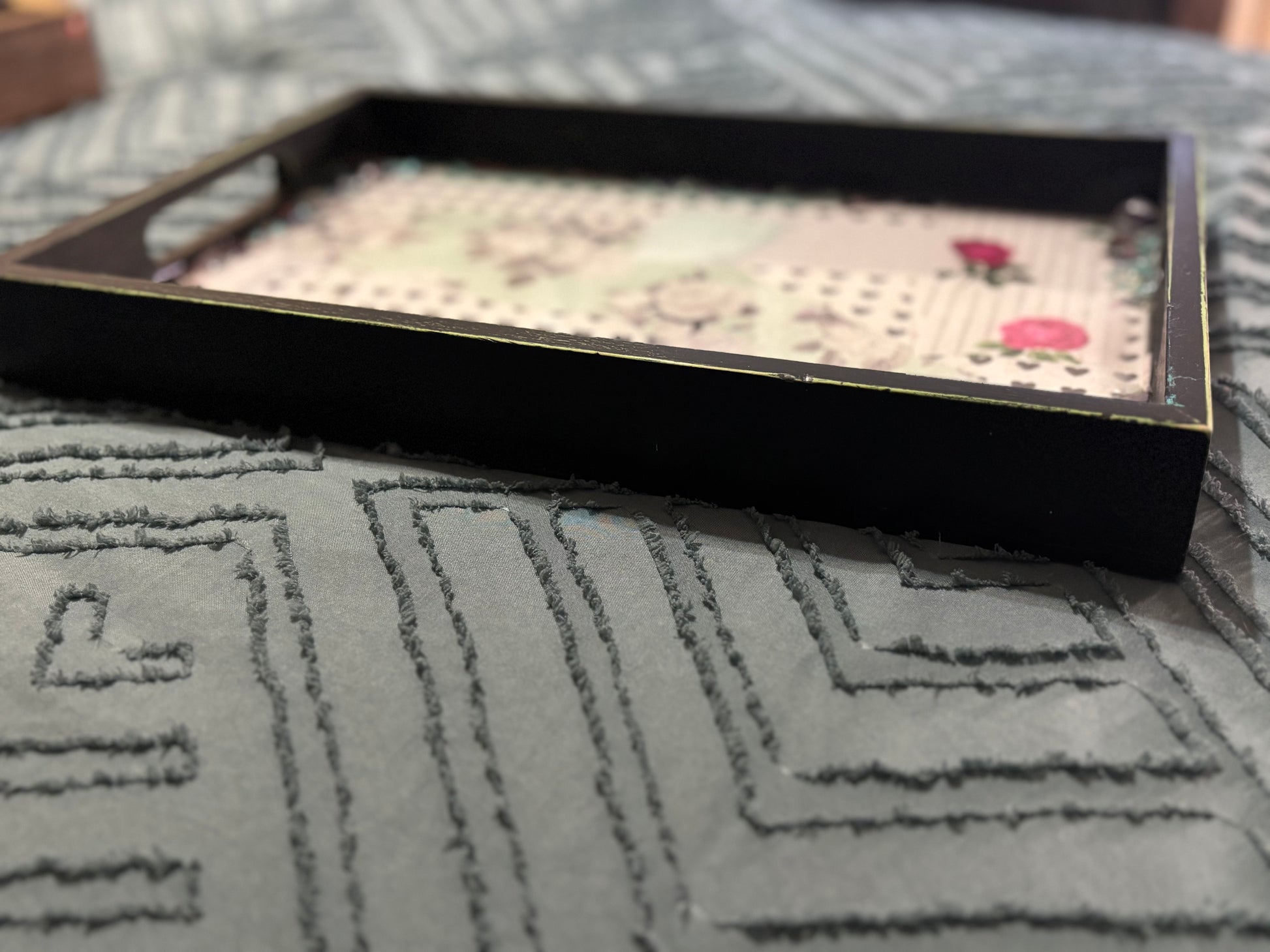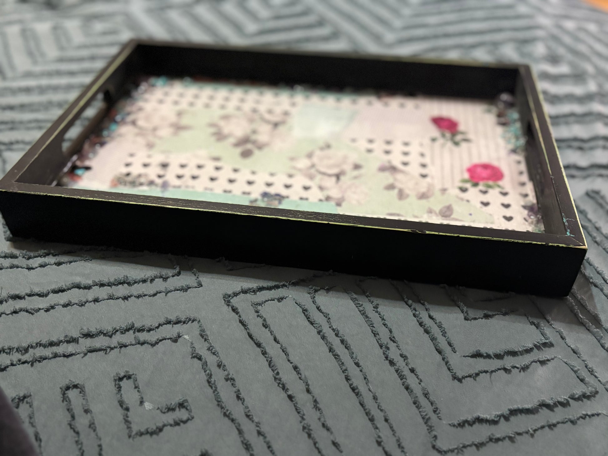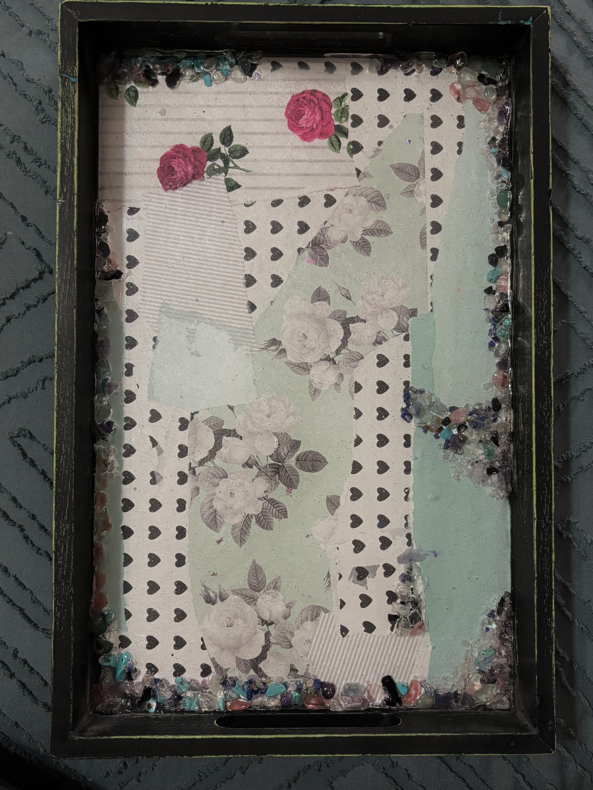 Wooden epoxy tray with crystals and floral background in the epoxy