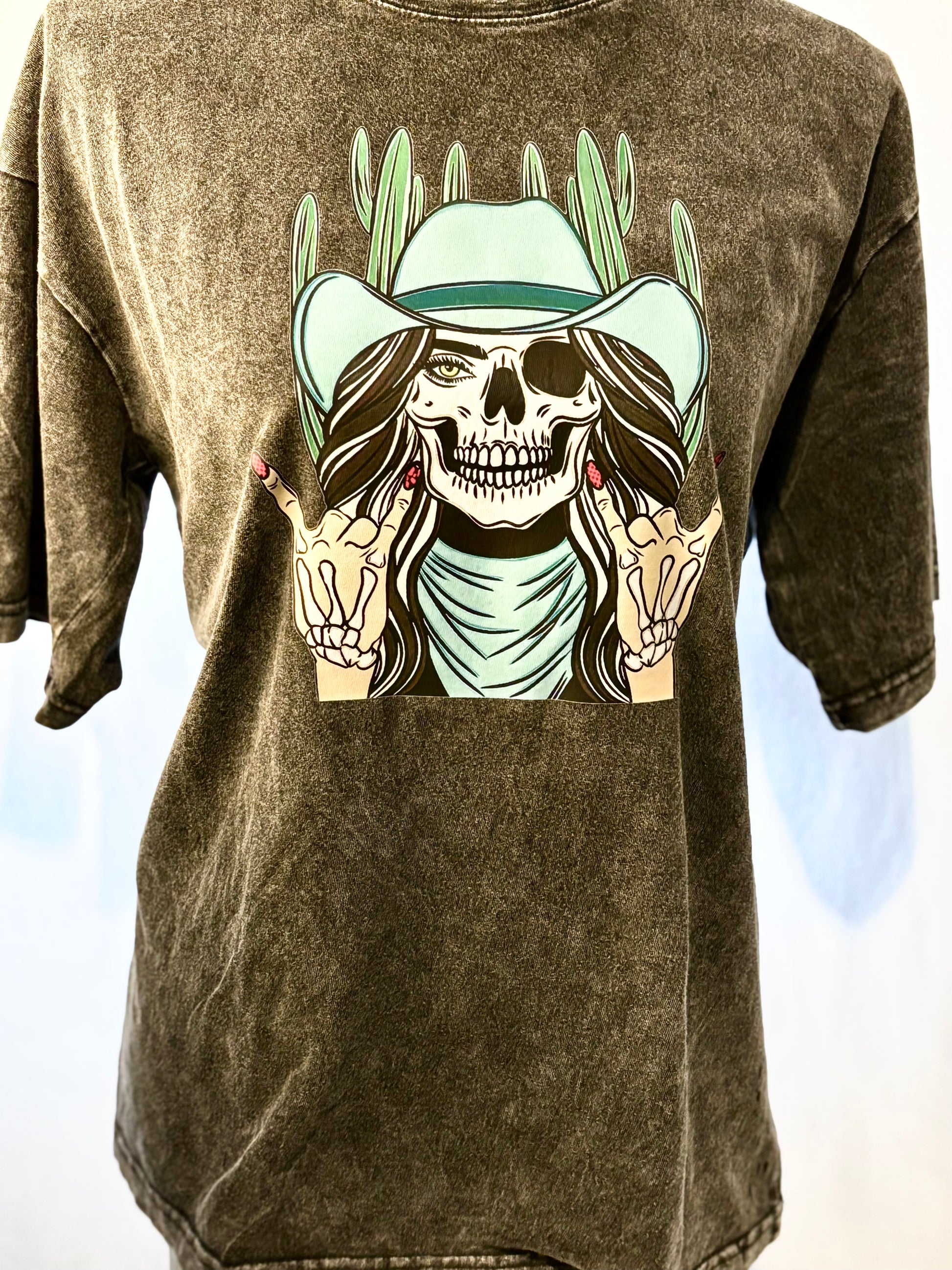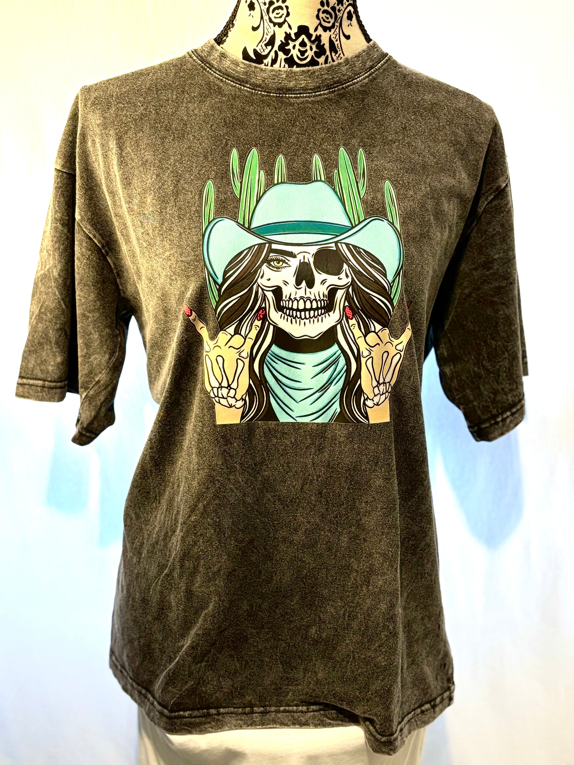 Wild Wanda Western Skull Tee is a women's western skull tee in vintage black that blends rugged rodeo-inspired style with everyday comfort. Crafted from 100% cotton, this tee offers a soft, breathable feel you can wear all day.